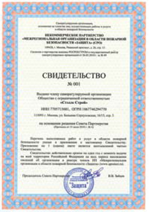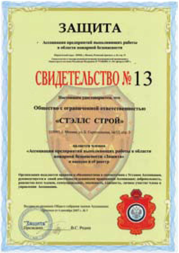 «Стэллс Строй» является членом Саморегулируемой организации основанной на членстве лиц, осуществляющих подготовку проектной документации – Некоммерческое партнерство «Гильдия архитекторов ипроектировщиков (СРО). Свидетельство о допуске к работам, которые оказывают влияние на безопасность объектов капитального строительства № 0047-2009-7705715681-П-2 от 21 мая 2009 года. «Стэллс Строй» является членом Саморегулируемой организации основанной на членстве лиц, осуществляющих работы и услуги в области пожарной безопасности– Некоммерческое партнерство «Межрегиональная организация в областипожарной безопасности «ЗАЩИТА» (СРО). Свидетельство № 001. Генеральный директор «Стэллс Строй» Зайцев В.В. избран Председателем Совета НП» Межрегиональная организация в областипожарной безопасности «ЗАЩИТА» (СРО).